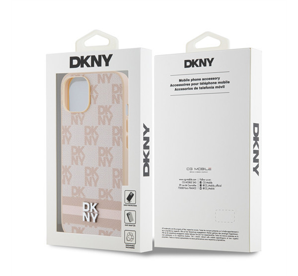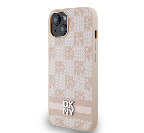 DKNY PU Leather Checkered Pattern and Stripe Apple iPhone 13 hátlap tok, rózsaszín