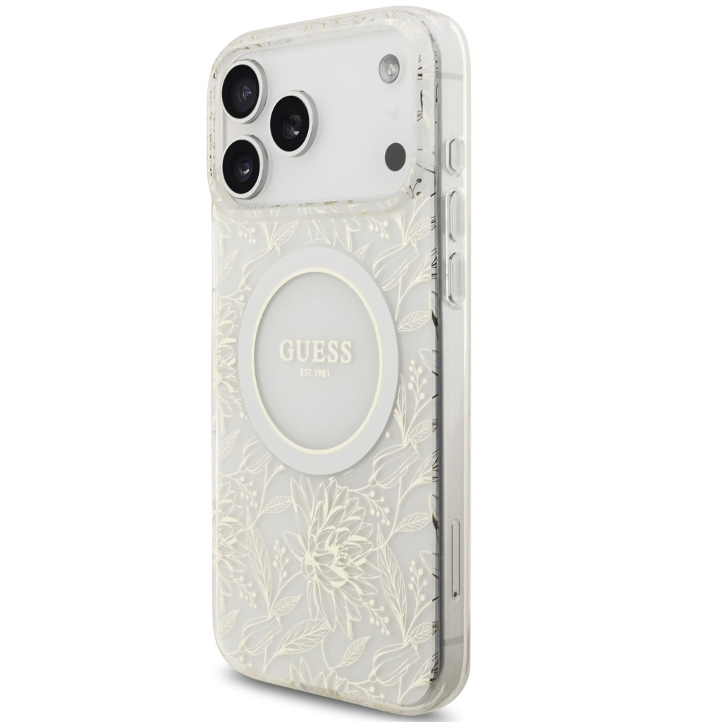Guess IML Flowers Allover Strap Apple iPhone 17 Pro MagSafe hátlap tok karpánttal, fehér
