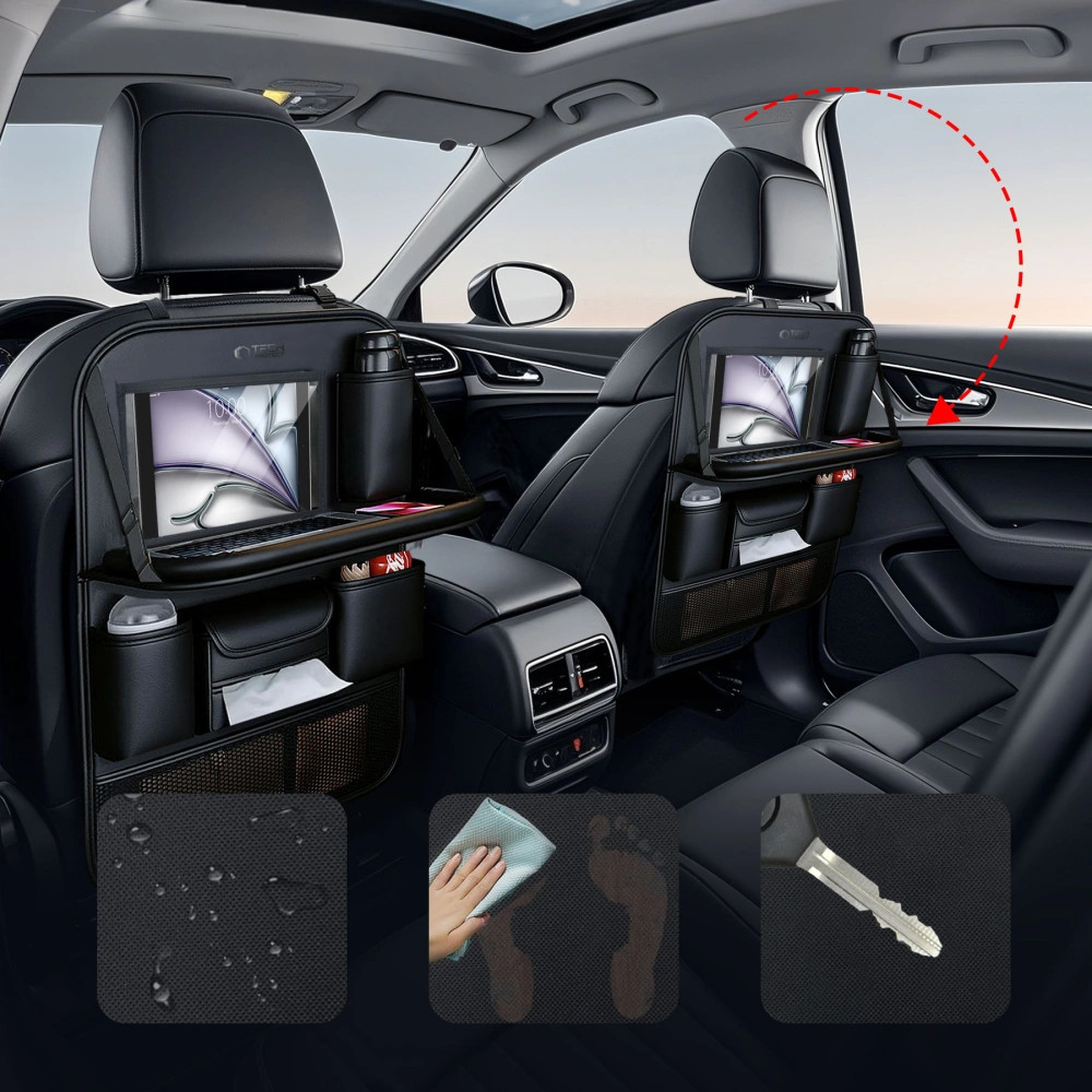 A szervező számos, praktikusan kialakított zsebbel és rekesszel rendelkezik különböző méretekben, amelyek lehetővé teszik a tablet, telefon, vizes palack, cumisüveg, gyermekjátékok, könyvek, dokumentumok, kulcsok, napszemüvegek és más apró tárgyak rendezett tárolását. A felső, átlátszó tablet tartó ideális filmnézéshez vagy játékhoz. A középen elhelyezett, kihajtható, stabil asztalka biztonságos munkavégzést tesz lehetővé egy kisebb laptopon vagy tableten billentyűzettel, azonnali mobil irodává vagy szórakoztató központtá alakítva a hátsó ülést.