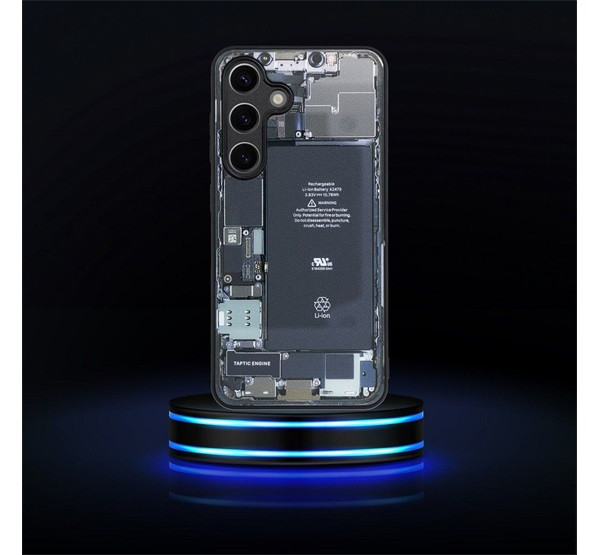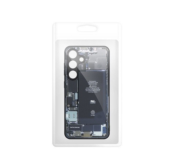 A hátlapot a telefon belsejét utánzó minta különbözteti meg . A tok szokatlan kialakítását a széleken és a belső oldalon elegáns matt fekete kivitel egészíti ki.