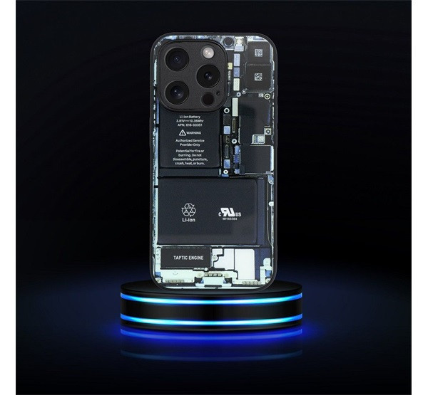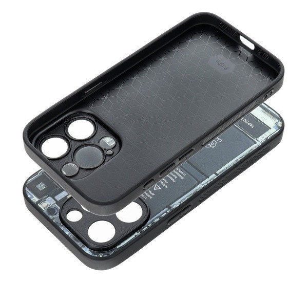 A hátlapot a telefon belsejét utánzó minta különbözteti meg . A tok szokatlan kialakítását a széleken és a belső oldalon elegáns matt fekete kivitel egészíti ki.