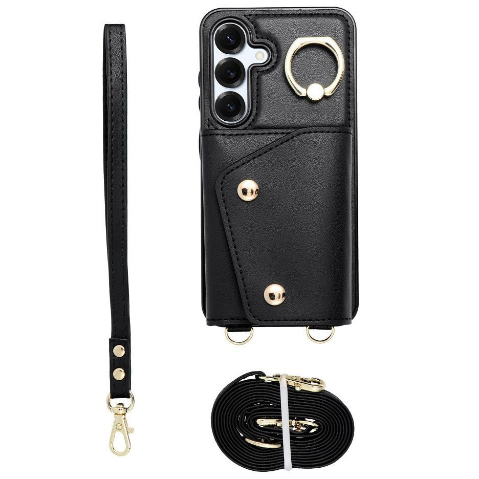 Wonder Samsung Galaxy S25 Ultra kártyatartós tok gyűrűs kitámasztóval, csuklóra / vállra akasztható pánttal, fekete