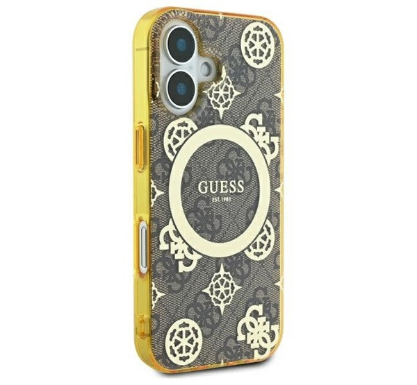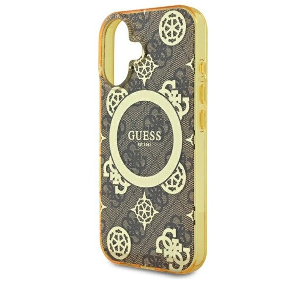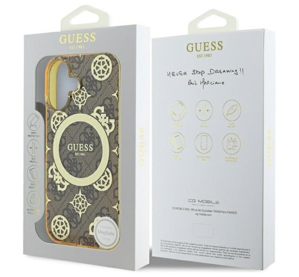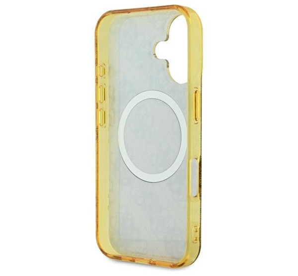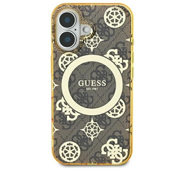 Ez az egyedi tok elegáns aranyszínű részletekkel hívja fel magára a figyelmet, köztük a márka jellegzetes emblémáival és a hozzá illő aranyszínű MagSafe gyűrűvel. A kiváló minőségű 4G nyomtatás, amely a Guess stílus ikonja, klasszikus, időtlen megjelenést kölcsönöz a toknak. Emellett a Guess logó finoman a mágneses gyűrű belsejében kapott helyet, tökéletesen kiegészítve az általános dizájnt.