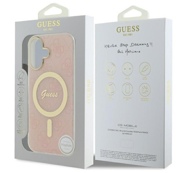 A 4G MagSafe kollekció elegáns tokját exkluzív, világszerte felismerhető 4G minta jellemzi. A 4G elemek elválaszthatatlan, jellegzetes motívumként sokféleképpen jelen vannak a neves divatház különböző kollekcióiban, ami egyben az általuk gyártott termékek legmagasabb minőségét is igazolja a világ piacain. A Guess koncepció jellemzője a legújabb divattrendek és a klasszikus stílus közötti egyensúly, miközben megőrzi a minták elegáns jellegét.