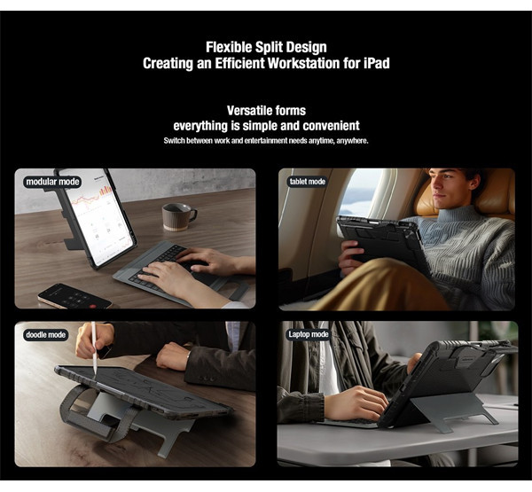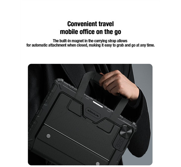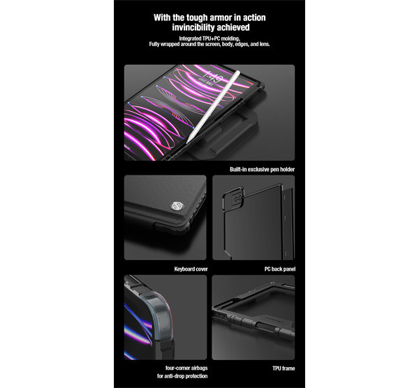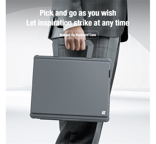 A Nillkin Bumper Go Keyboard Case egy többcélú táblagép védőburkolat, amely kivehető, háttérvilágítással ellátott billentyűzettel, Apple Pencil foglalattal és fokozatmentesen állítható táblagép-szöggel rendelkezik.