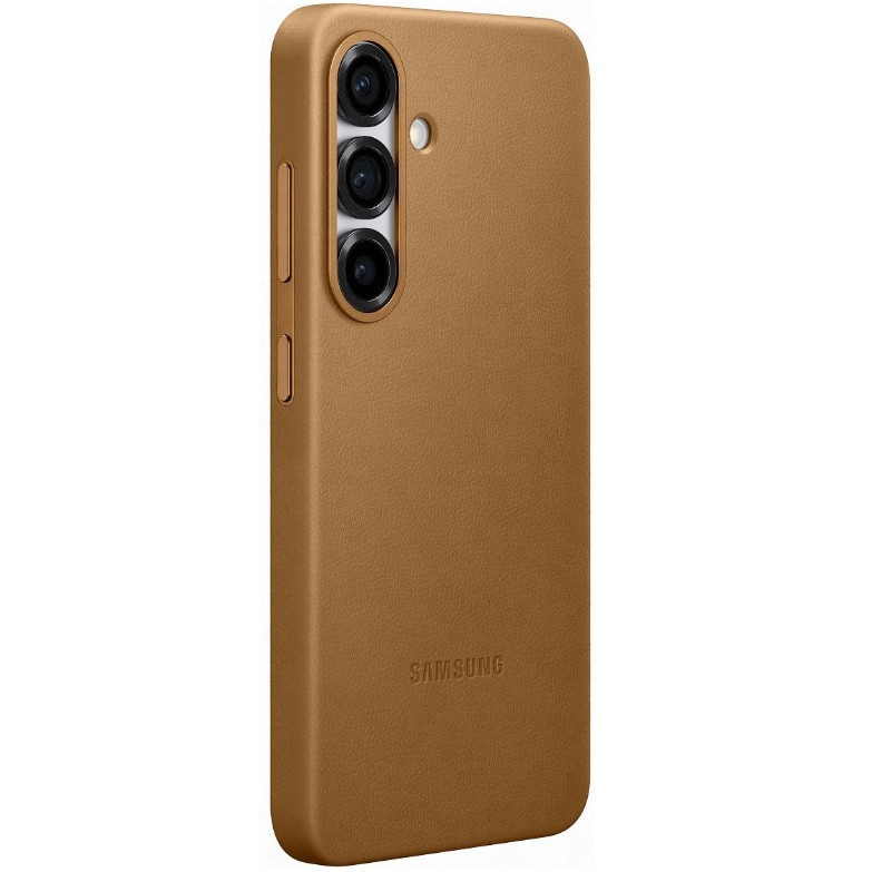 Egy tevebarna bőrtokba helyezett Galaxy S25 látható a jobb felső sarka irányából, kijelzővel felfelé. A kijelzőn képernyővédő grafika fut. Egy másik, átlósan elhelyezett Galaxy S25 felső része látható az előzővel megegyező bőrtokban, megdöntve. Két bőrtok látható, mindkettő egy Galaxy S25 készülékre felhelyezve, függőleges irányban, hátulról. Az egyik szürke, a másik tevebarna.