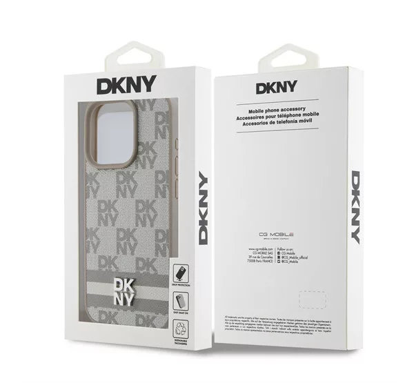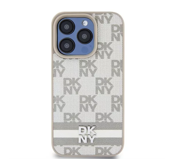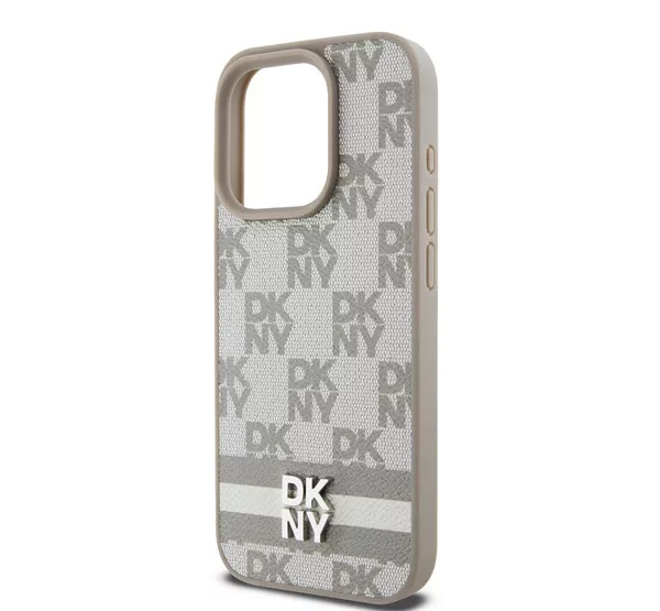 DKNY PU Leather Checkered Pattern and Stripe iPhone 14 Pro Max hátlap tok, bézs