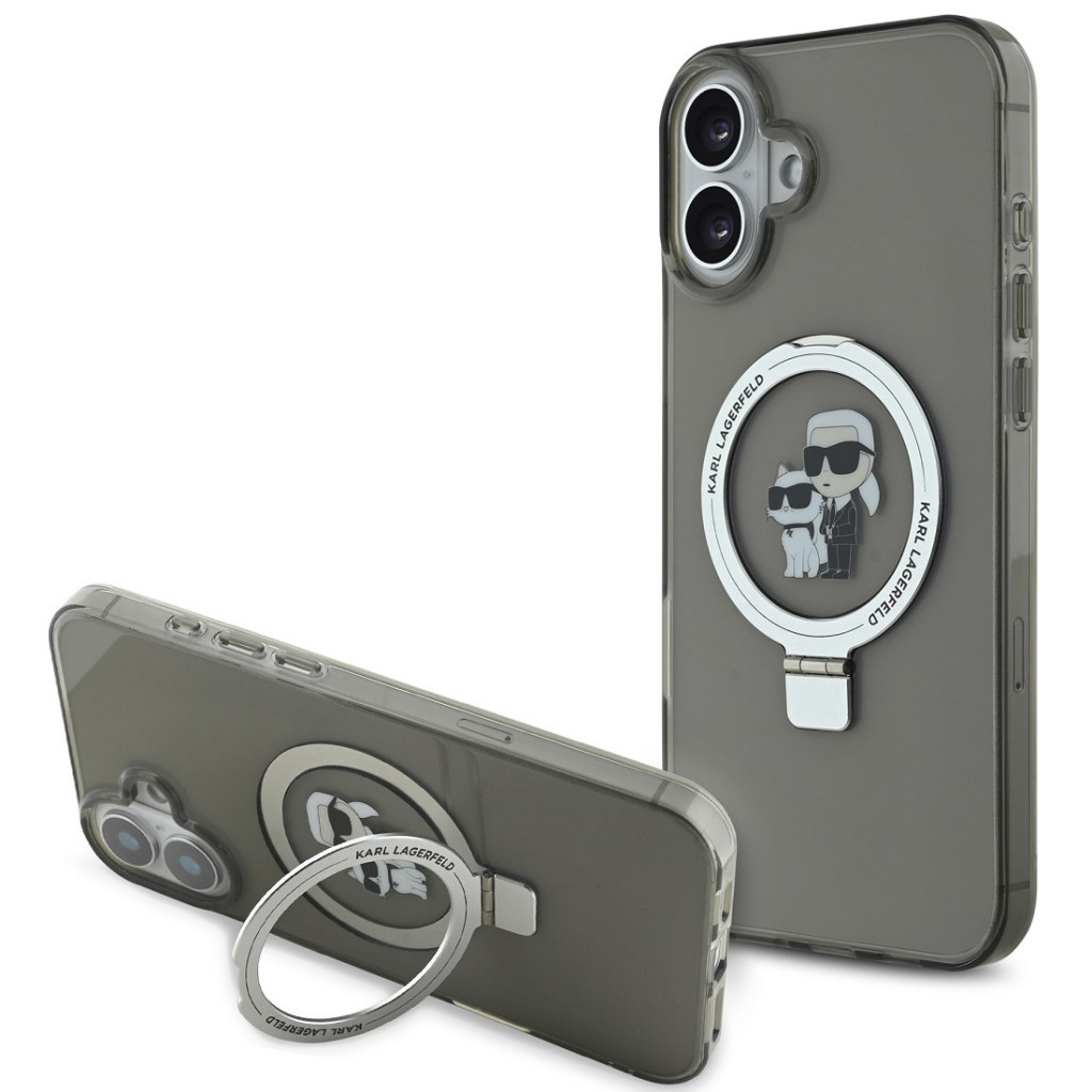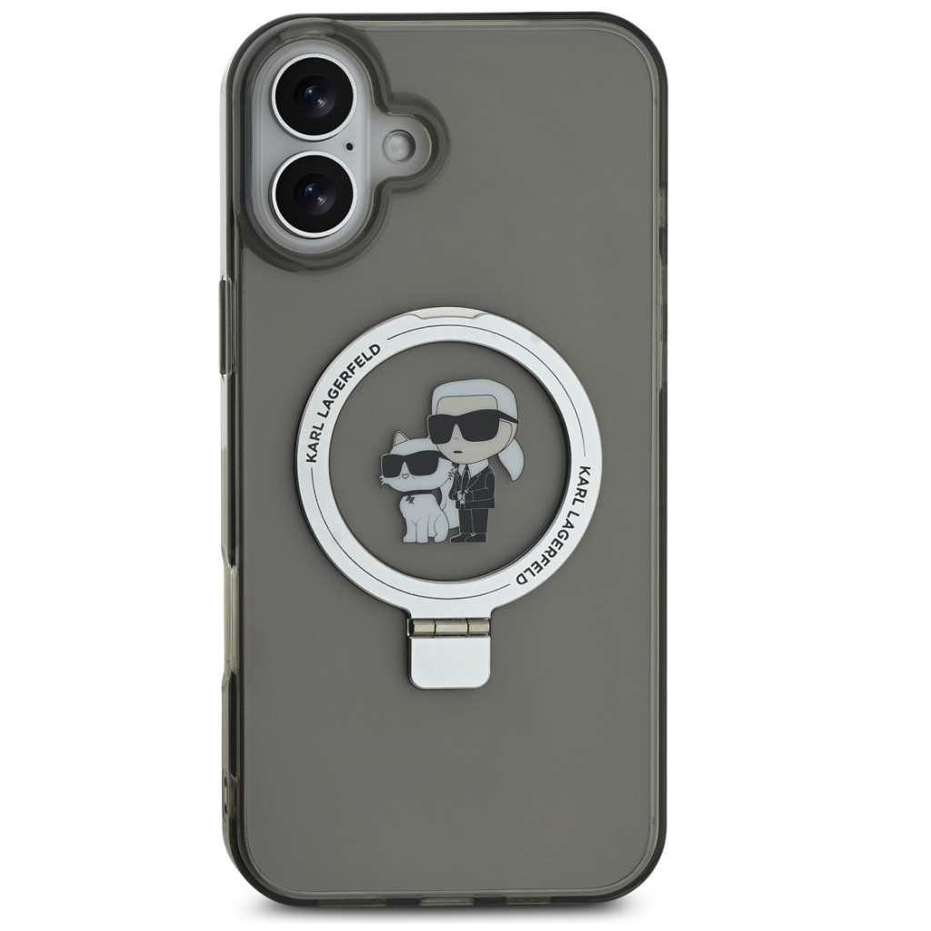 Karl Lagerfeld Ringstand Karl and Choupette iPhone 16 MagSafe tok kitámasztóval, fekete